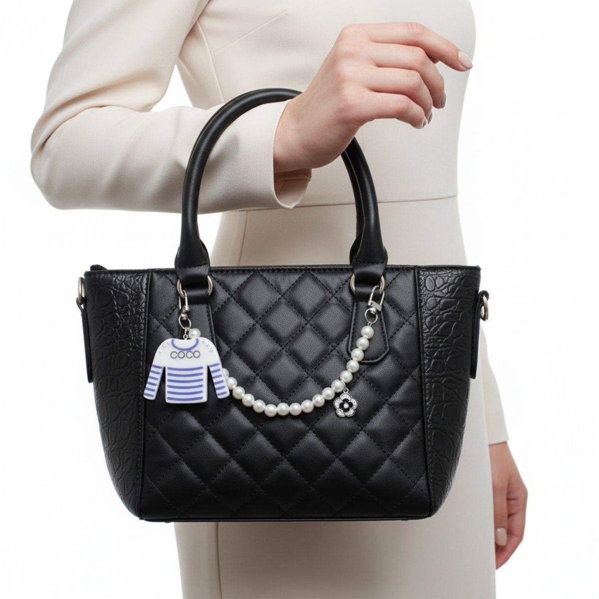 Women's Keychain and Bag Clip. Luxe French Designer White Acrylic Pearl Bag Clip Keychain with Shirt Shaped White Acrylic and Blue Stripes Charm Featuring COCO Detail and Black Rhinestone Camellia Flower Charm. Burnished Silver Metal Swivel Hook Closure.