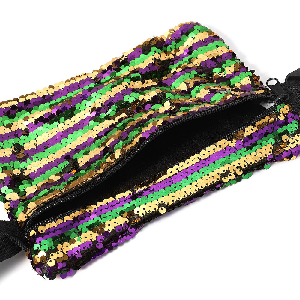 Sequin Mardi Gras fanny pack with adjustable strap and zip closure. Eye-catching, hands-free style ideal for festivals, parades, and party nights.