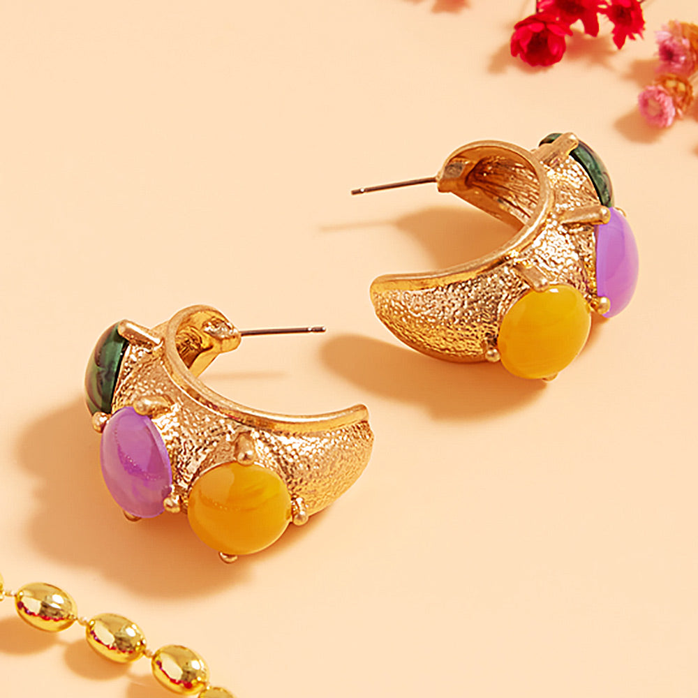 Elevate your style with these chunky multicolor stone earrings. Set in textured gold-tone metal, each vibrant gem adds a touch of bold elegance. Perfect for making a statement at parties, events, or adding flair to everyday outfits.