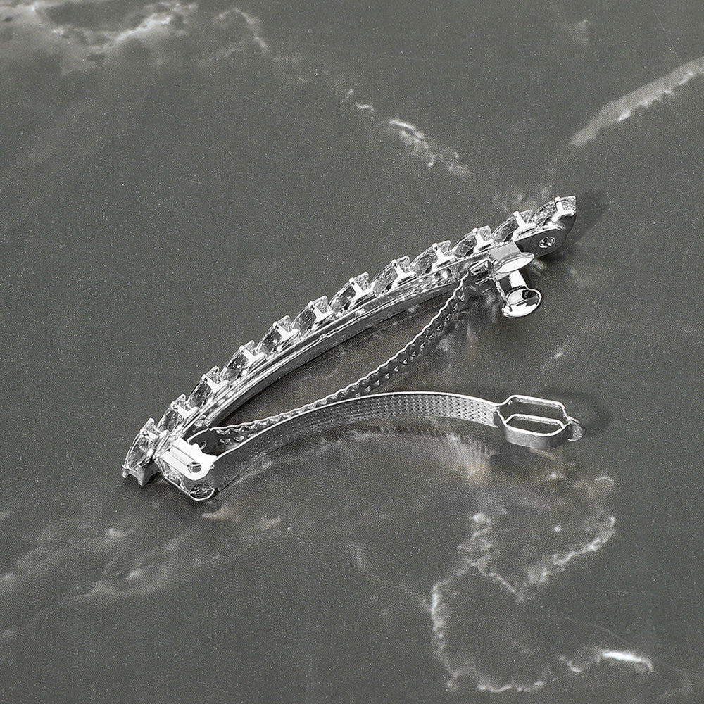 Chic hair clip featuring a row of marquise-cut crystals in a curved setting. Adds a touch of sophistication to any hairstyle for special occasions or daily wear. Secure clasp holds hair in place with style.