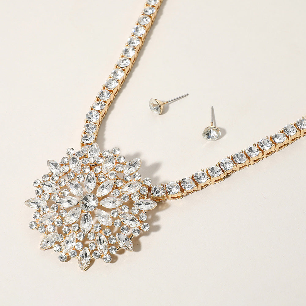 Elegant jewelry set featuring a dazzling snowflake pendant and matching stud earrings. Adorned with radiant rhinestones, ideal for weddings, formal events, or adding sparkle to special occasions.