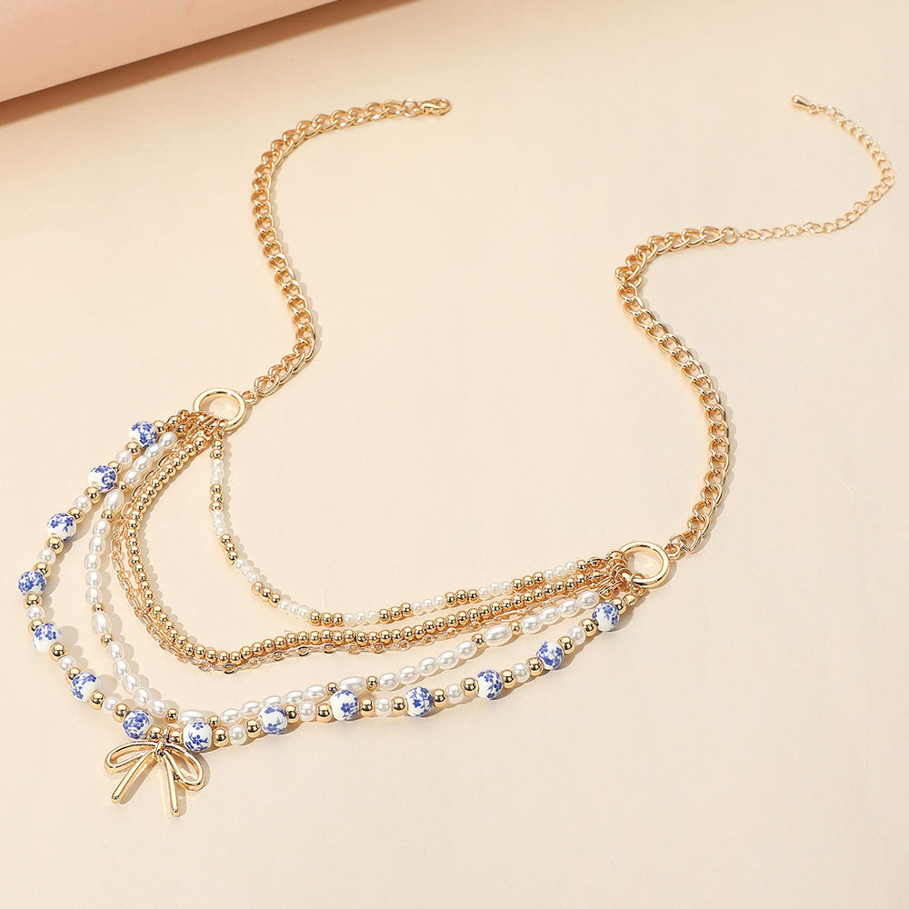 Elegant layered necklace featuring multiple beaded strands and a delicate bow charm. Perfect for adding charm and texture to casual or dressy outfits.