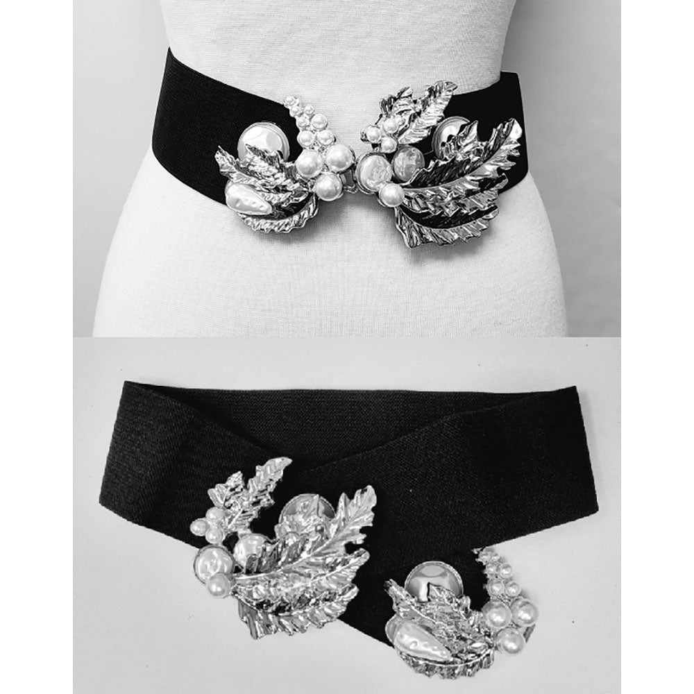 iLLASPARKZ Metal Leaves Pearl Embellished Buckle Pointed Elastic Belt