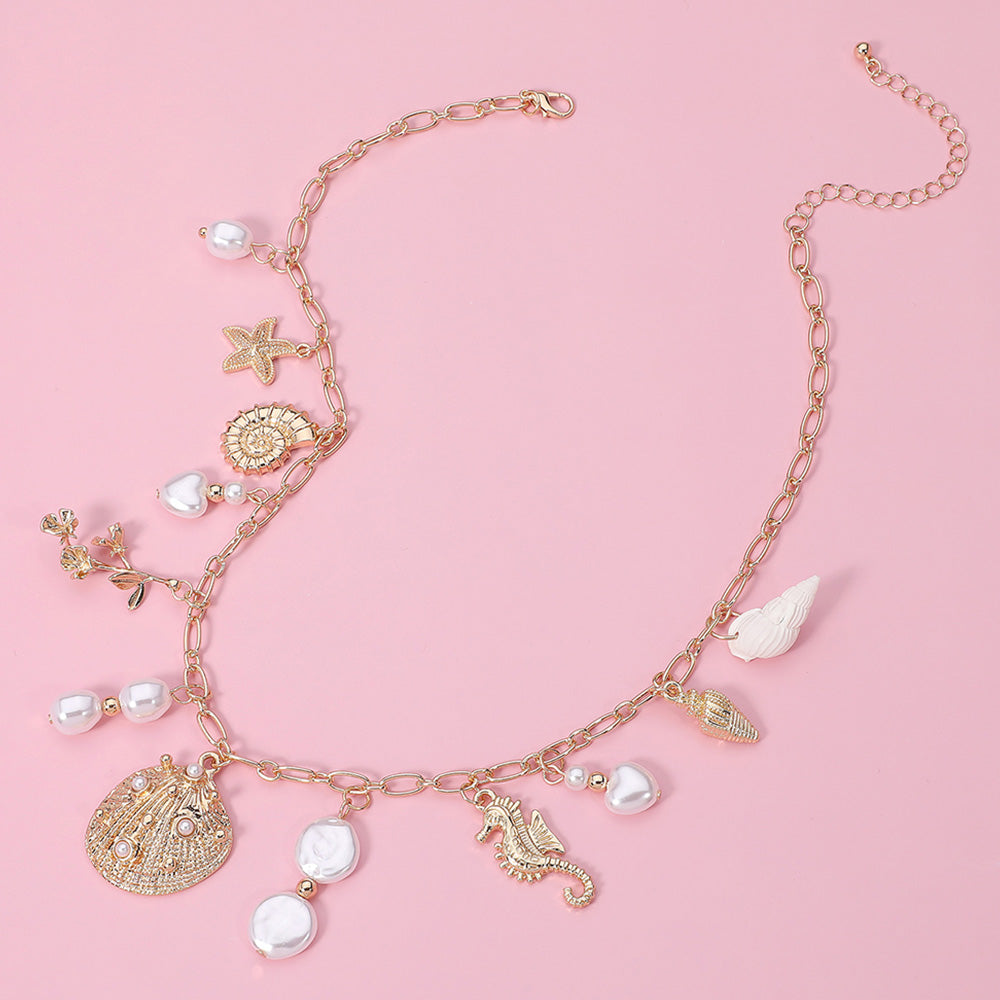 iLLASPARKZ Metal Shell Starfish Seahorse Pearl Charm Station Necklace