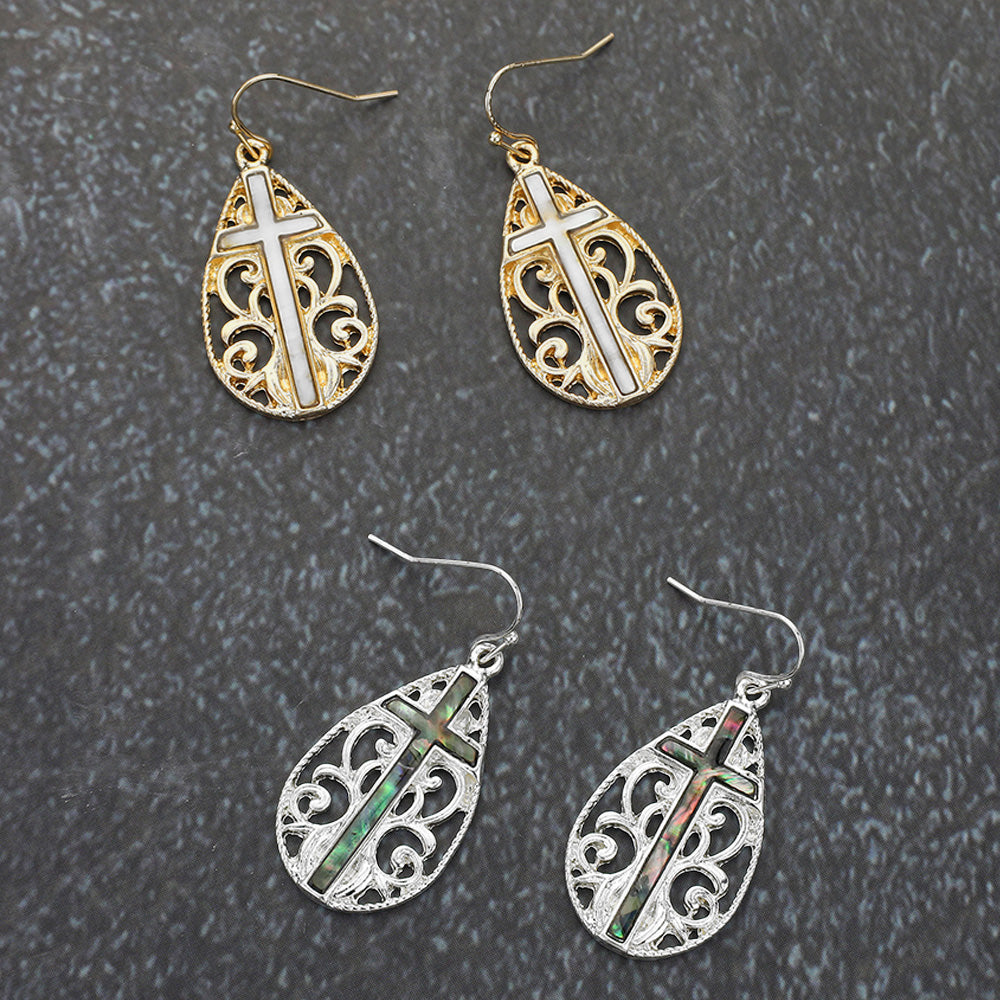 iLLASPARKZ Mother Of Pearl Cross Centered Filigree Teardrop Dangle Earrings