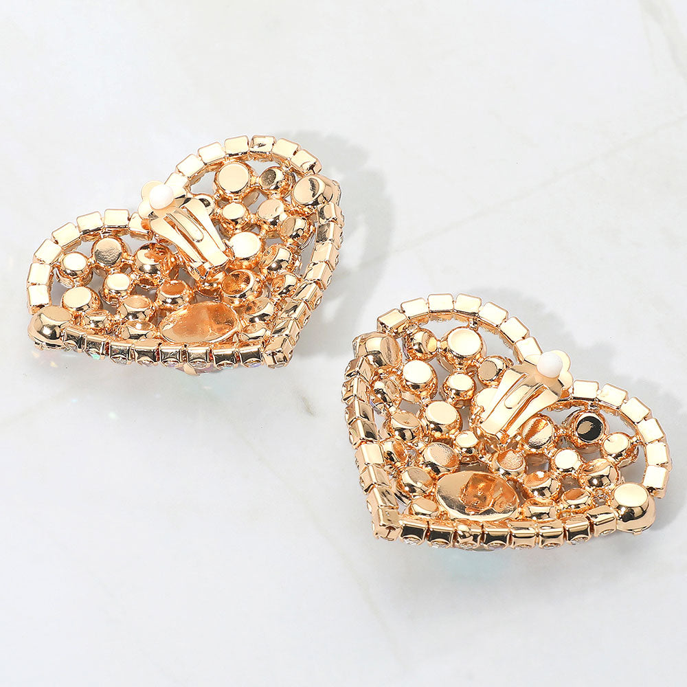 Elegant heart-shaped clip-on earrings adorned with radiant rhinestones. A glamorous accessory that offers comfort and standout sparkle for special occasions, parties, or everyday flair.
