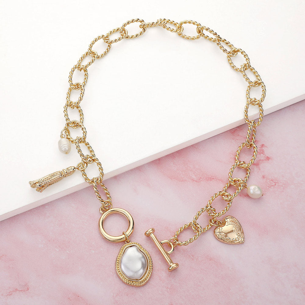 iLLASPARKZ Pearl Metal Heart Tassel Charm Station Chunky Chain Toggle Necklace