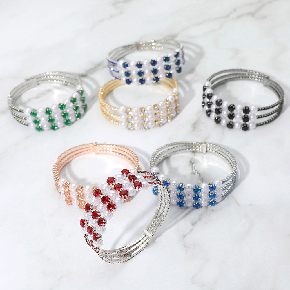Chic adjustable bangle bracelet featuring a trio of strands with pearl and crystal accents. A perfect accessory for formal events, parties, or polished everyday wear.