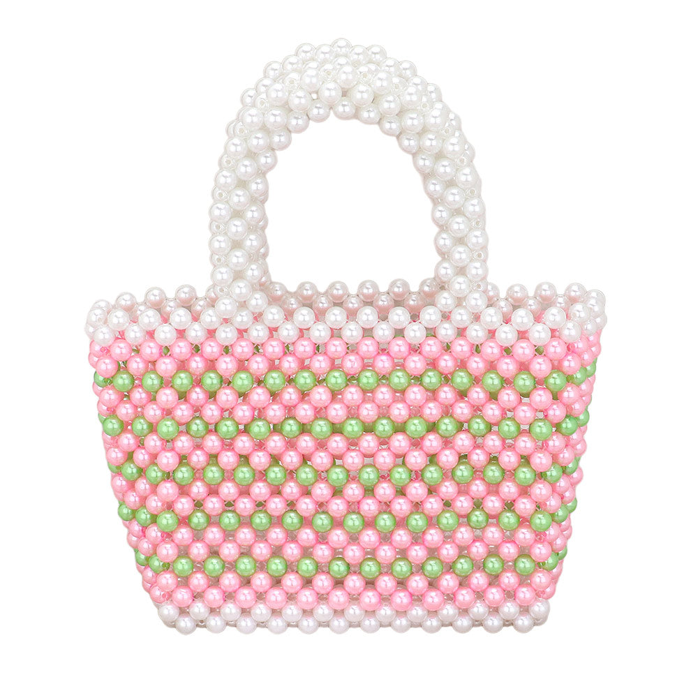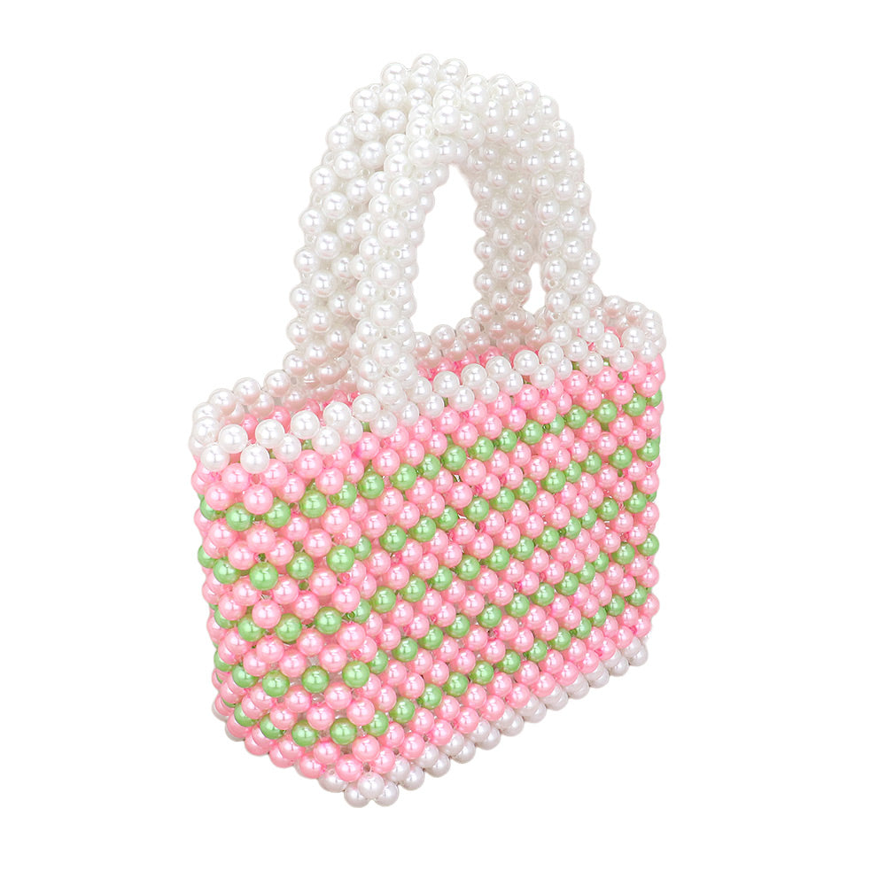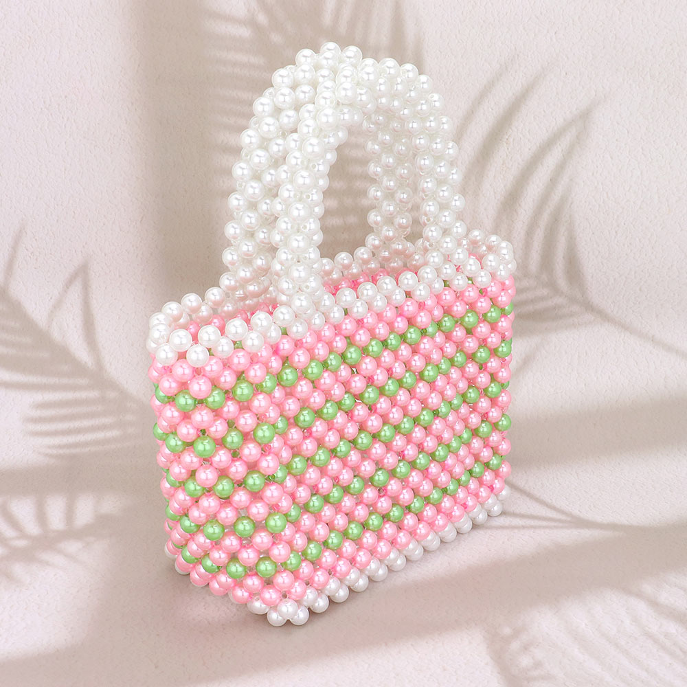 This mini handbag features a refined beaded exterior with a structured silhouette and curved top handles. Ideal for evening events or statement accessorizing, it brings a bold yet elegant flair to any outfit.