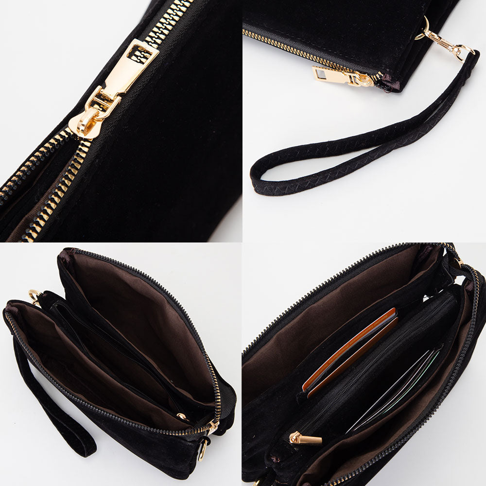 Elevate your everyday look with this minimalist faux suede crossbody clutch. Featuring a smooth zip closure, detachable wristlet strap, and adjustable shoulder strap, this compact bag offers versatile wear as a clutch, shoulder bag, or crossbody. Perfect for daily errands, travel, or casual outings.