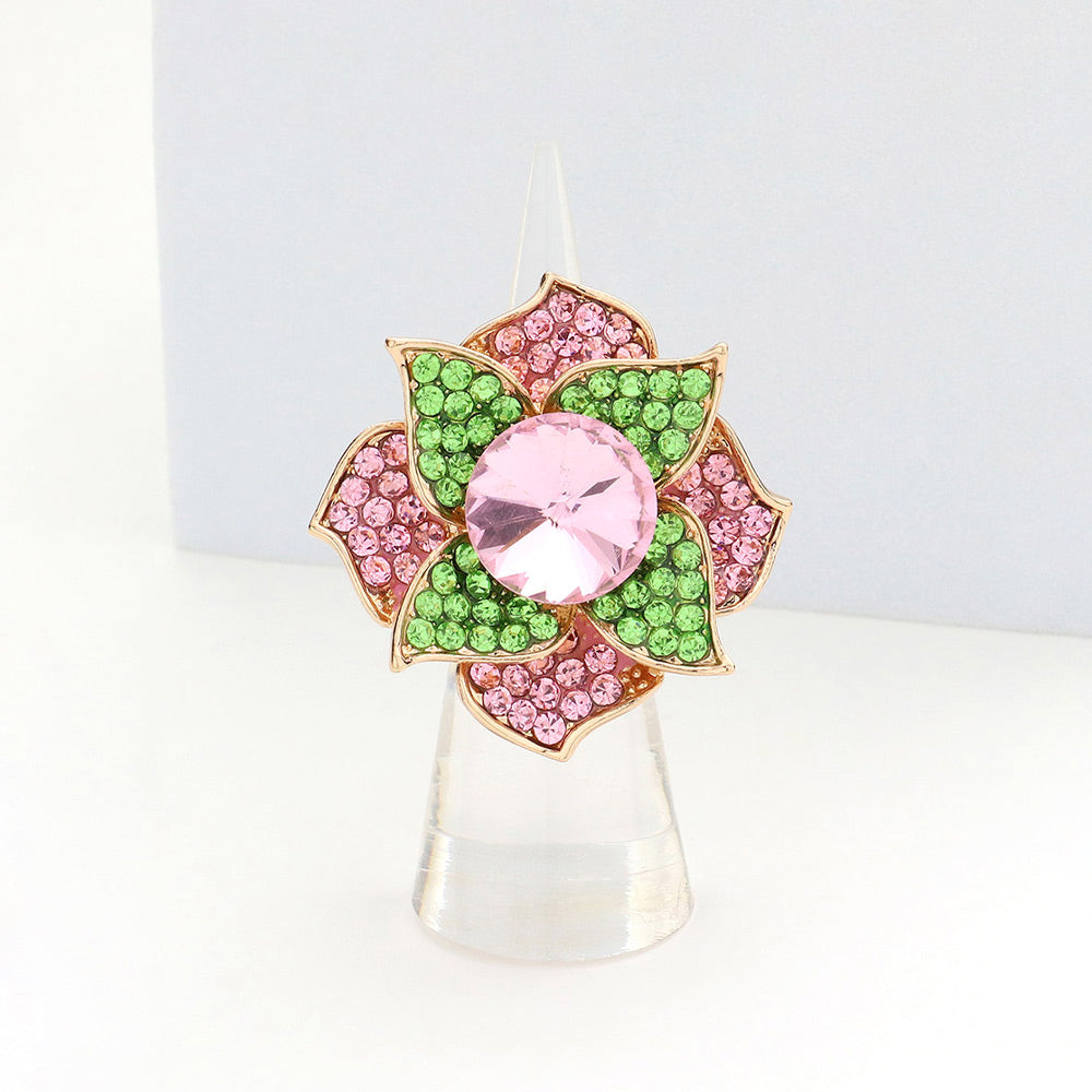 Eye-catching floral statement ring with sparkling crystal petals and a bold center gem. A perfect cocktail ring to elevate your look for parties, events, or fashion-forward everyday wear.