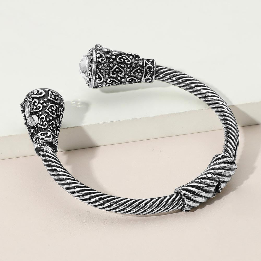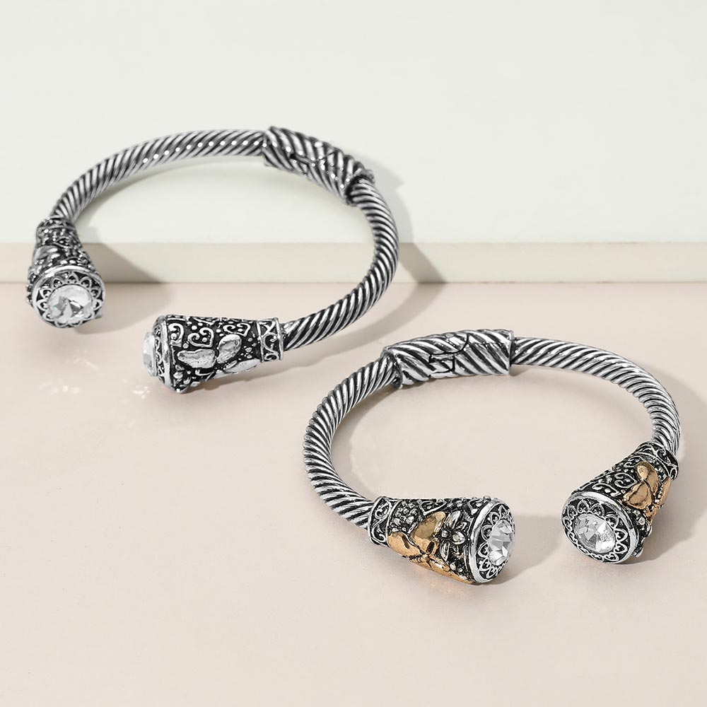 iLLASPARKZ Round Stone Tip Butterfly Flower Embossed Antique Metal Hinged Cuff Bracelet