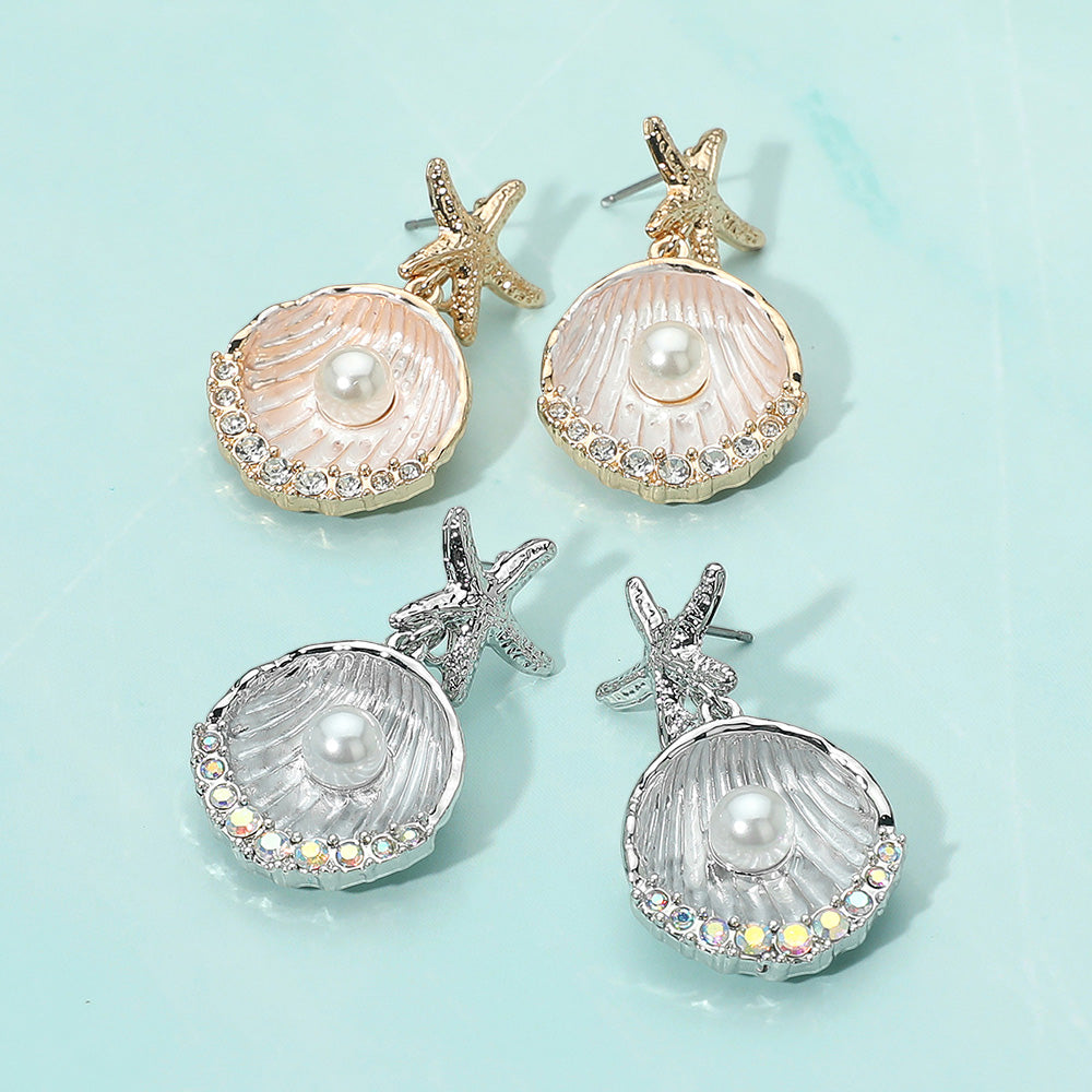 Embrace seaside elegance with these starfish and shell pearl earrings, accented with shimmering details for a chic ocean-inspired look. Perfect for beach weddings, summer outings, or adding a nautical touch to your style, these earrings make a statement accessory for any jewelry lover.