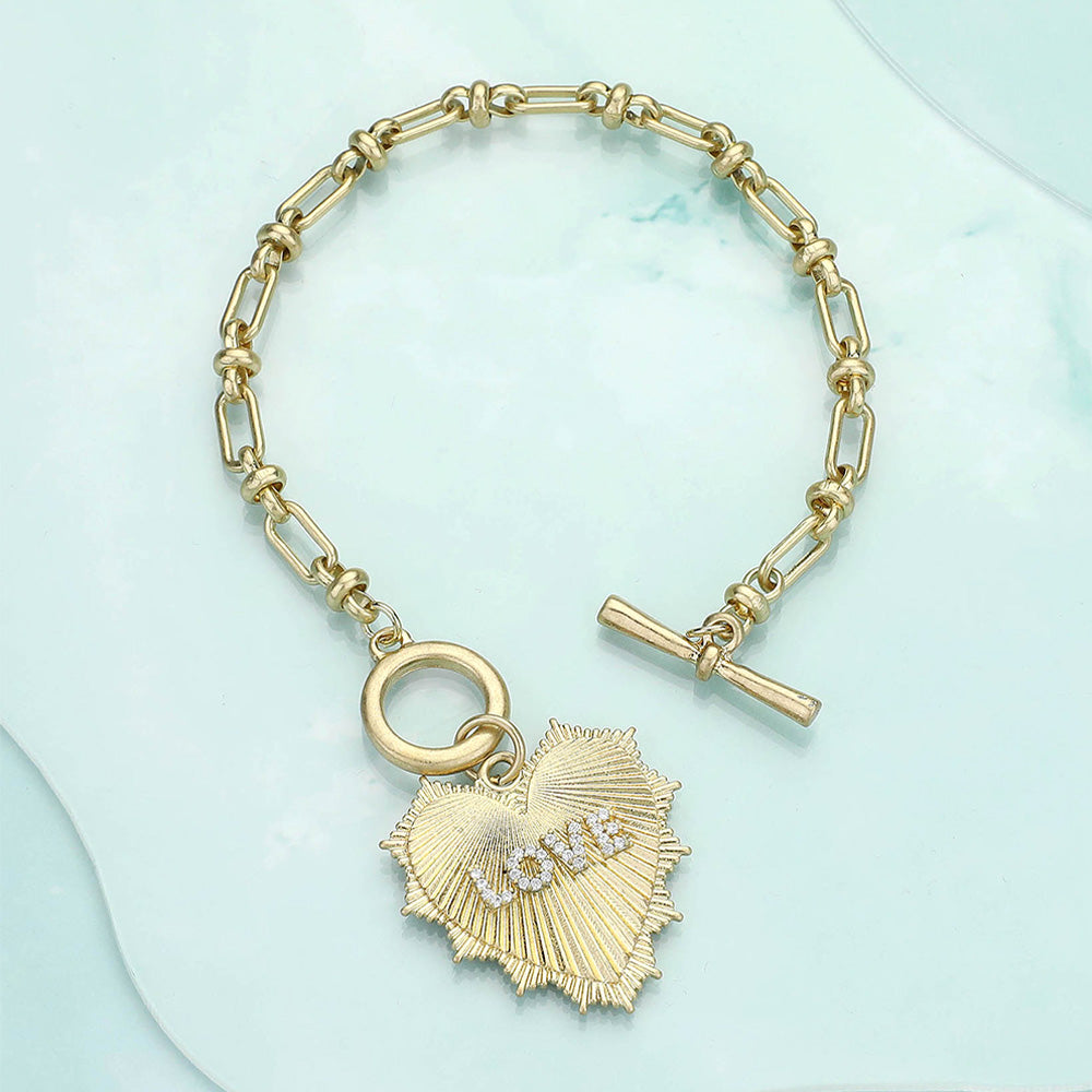 iLLASPARKZ Stone Paved LOVE Message Accented Textured Heart Charm Industrial Chain Toggle Bracelet