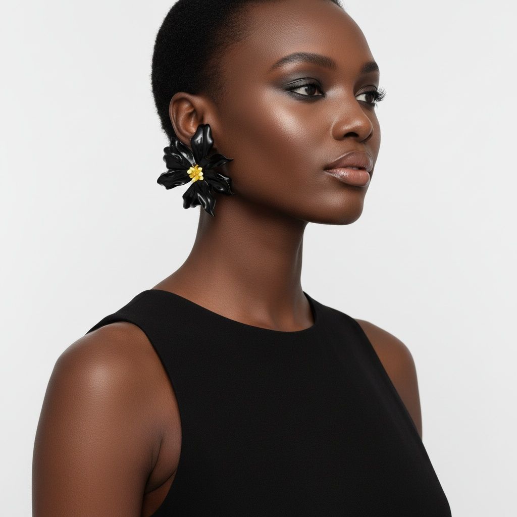 Stud Black Flower Oversized Wavy Petal Earrings
