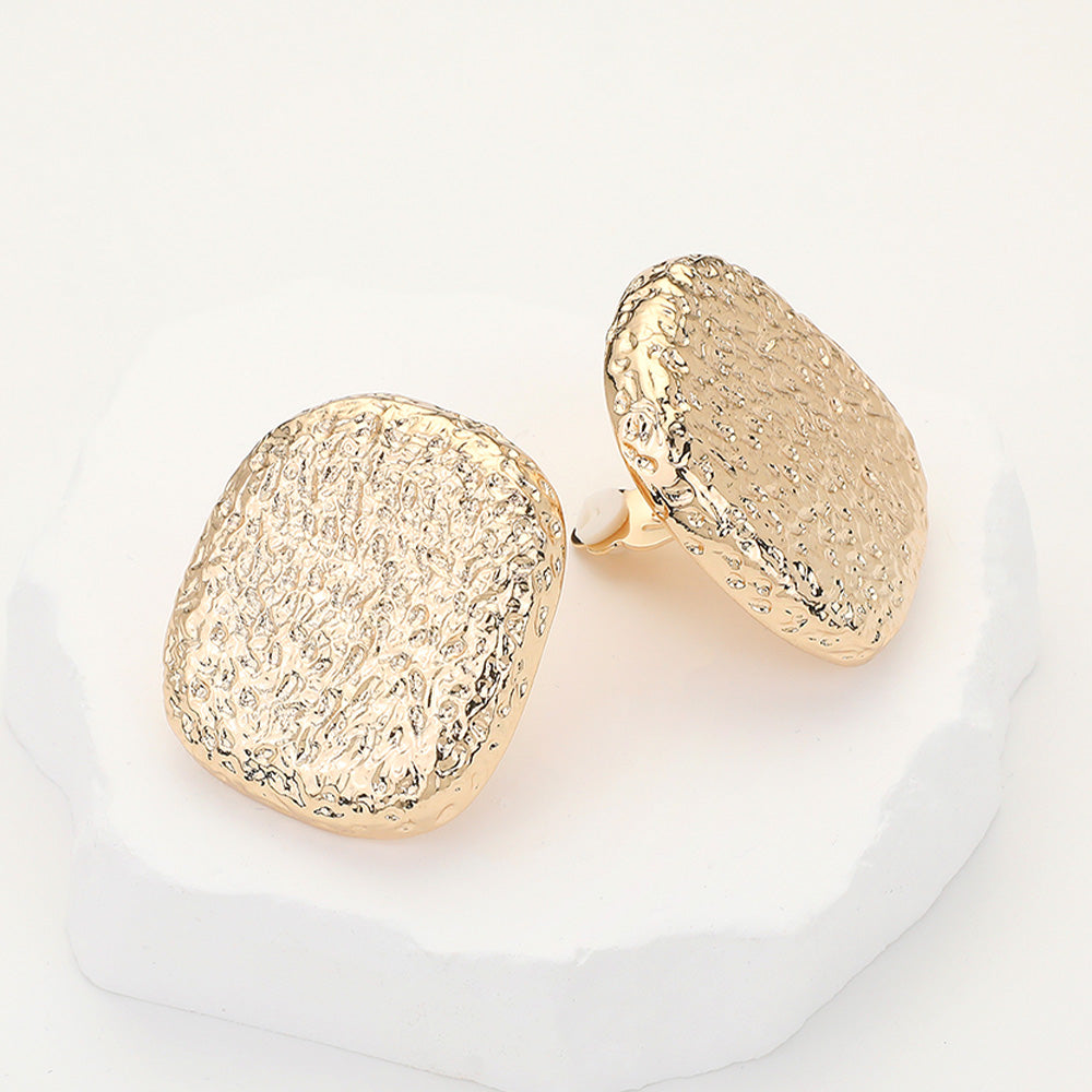 Elegant textured oval clip-on earrings with a bold hammered finish. Designed for comfort and style, these statement earrings elevate any outfit with their modern edge. A versatile accessory perfect for casual looks, evening wear, or special occasions without the need for pierced ears.