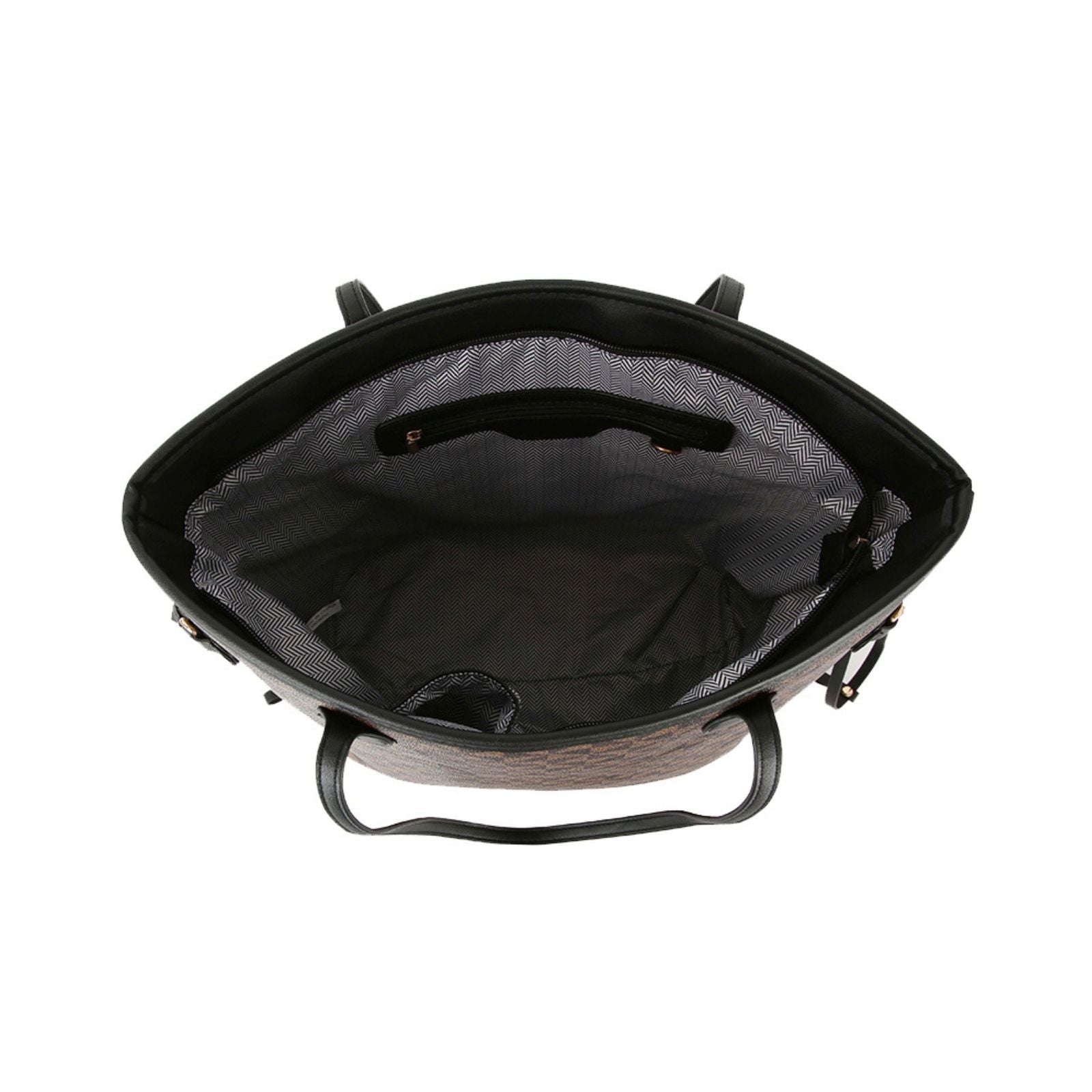 Women's Tote Shoulder Bag Set. Medium Brown and Dark Brown Vegan Faux Leather Tote Shoulder Bag Featuring Monogram Diamond Plaid Pattern and Black Faux Leather Trim. Main Zipper Closure. Rear Zipper Pocket. Lined Interior. Adjustable Side Cinch Straps. Includes Large 11" x 8.25" Zipper Pouch and Zipper Wallet with Center Zipper Pocket and Card Slots. 3 Pcs Set.