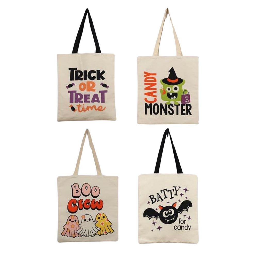 Celebrate Halloween with this festive "Trick or Treat Time" canvas tote! Perfect for kids' candy collecting, this reusable bag features fun lettering and colorful candies. Lightweight with sturdy handles for a night full of treats!
