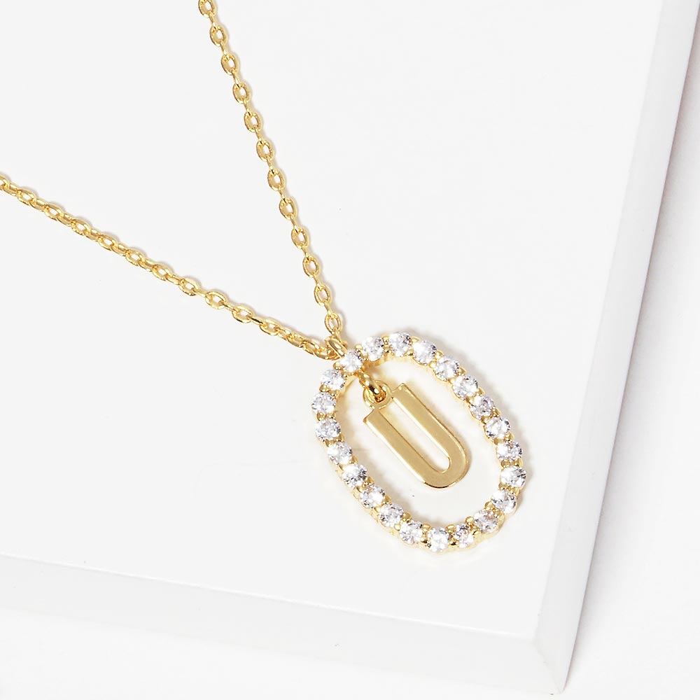 iLLASPARKZ -U- Gold Dipped Metal Monogram Rhinestone Oval Link Pendant Necklace